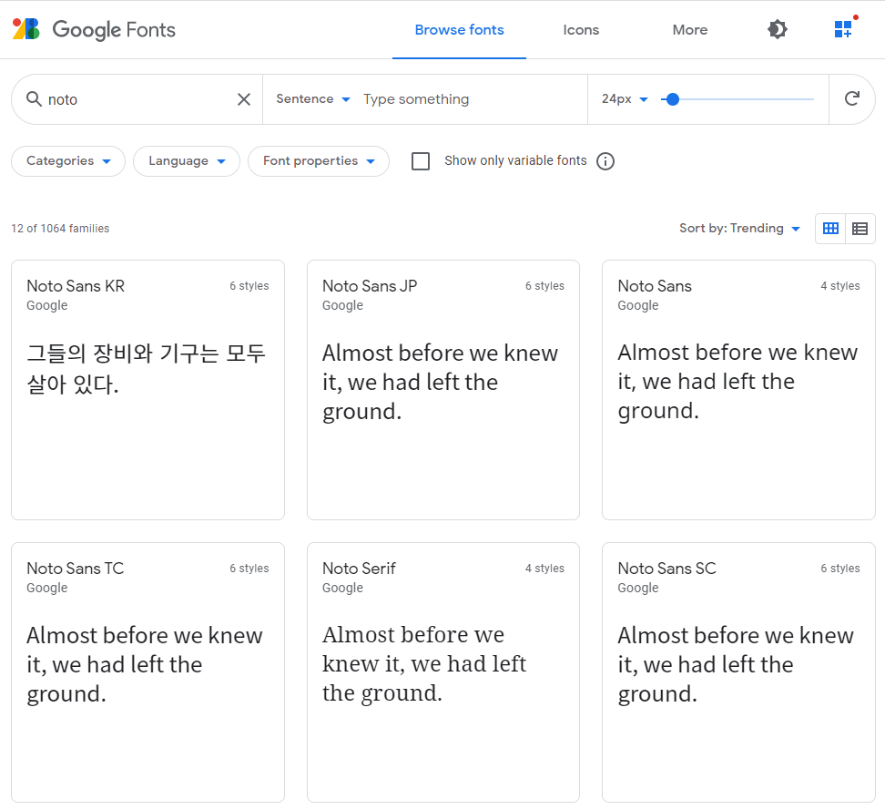 검색창에 Noto만 쳐봐도 많은 글꼴을 확인할 수 있지만..