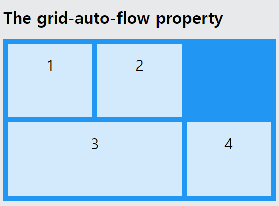 | grid-auto-flow | 자동 배치된 항목이 그리드에 삽입되는 방법을 지정 |