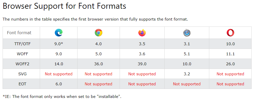 edge, chrome, firefox, safari, opera 다섯 가지의 브라우저를 기준으로 지원하는 포맷 양식 테이블이네요