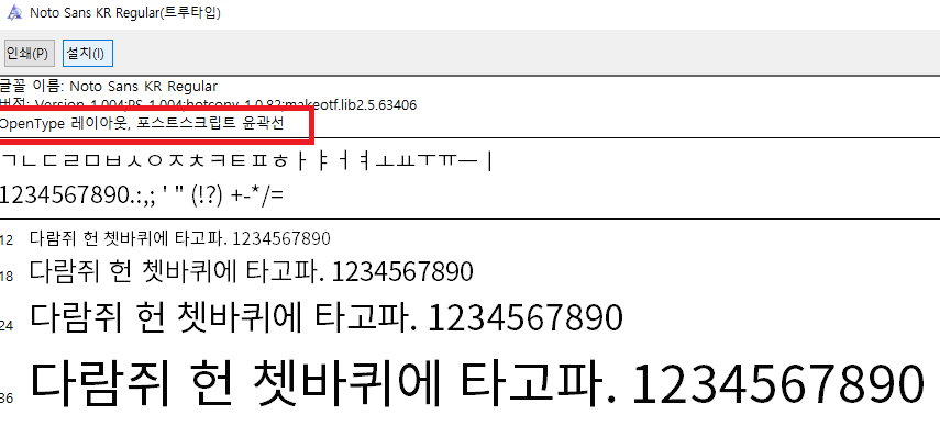 위 빨간 네모에 보면 OpenType레이아웃, 포스트스크립트 윤곽선이라고 보이네요