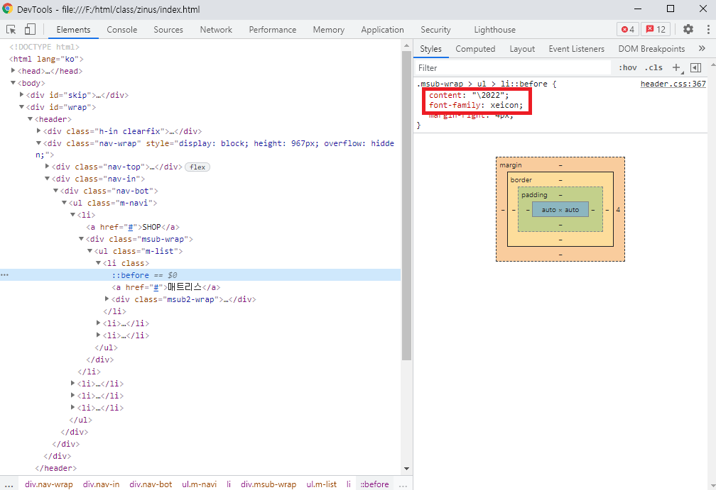 아니면 오른쪽 css처럼 content속성에 유니코드로 집어넣어도 좋습니다.