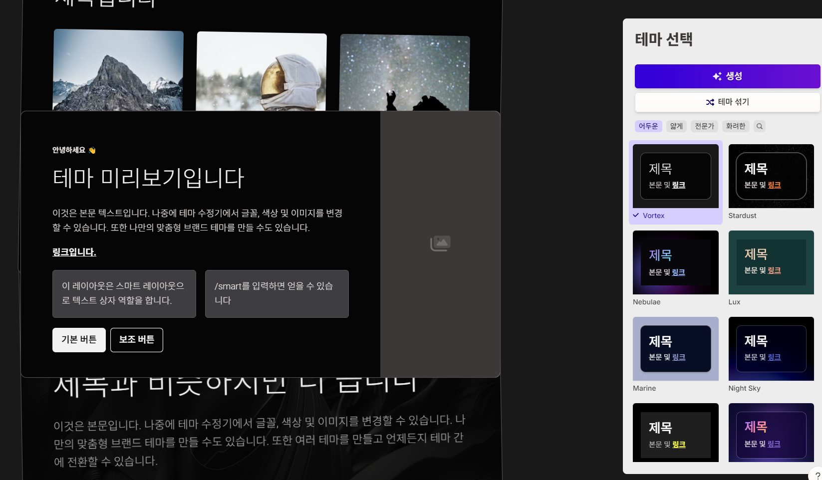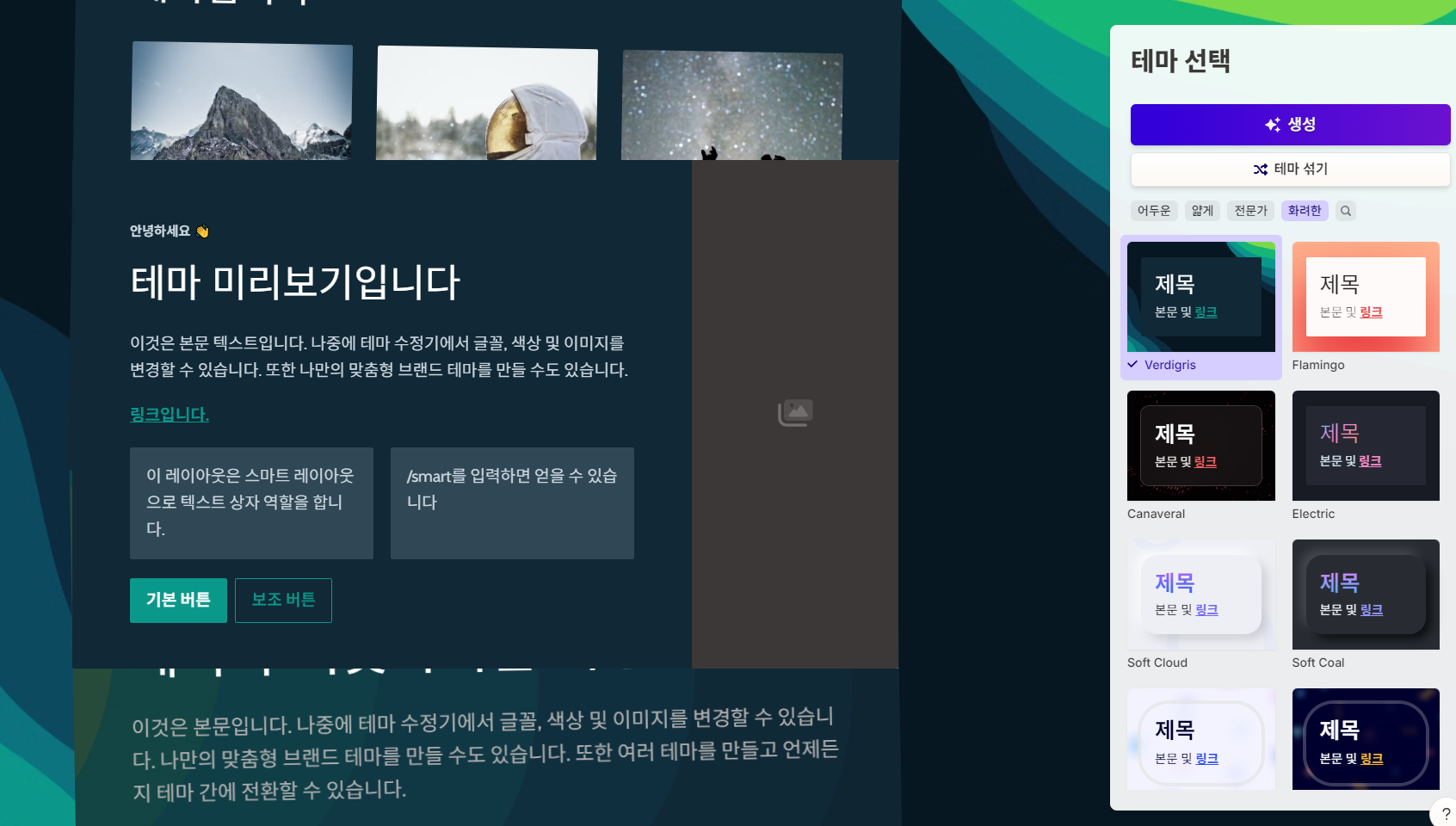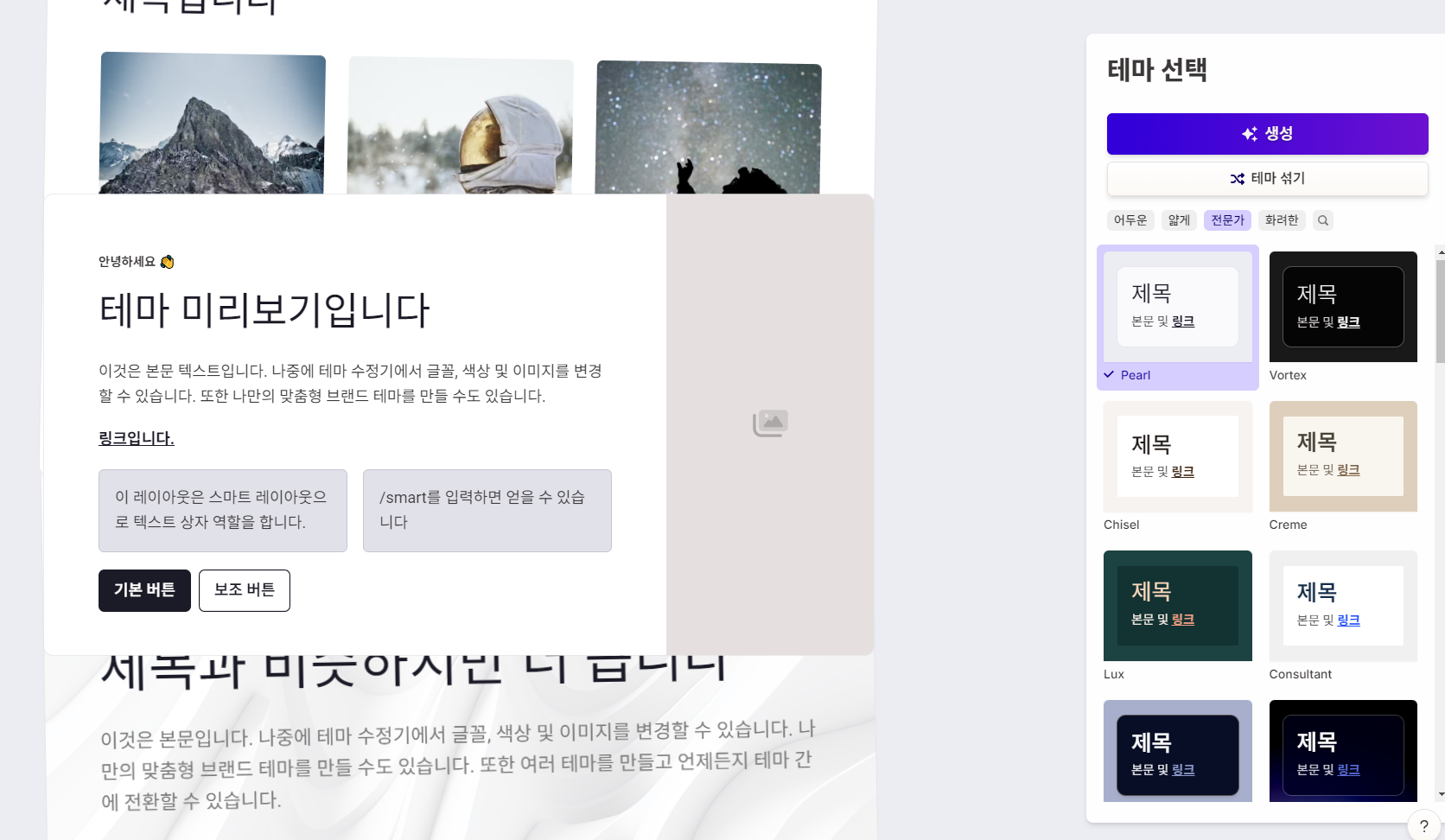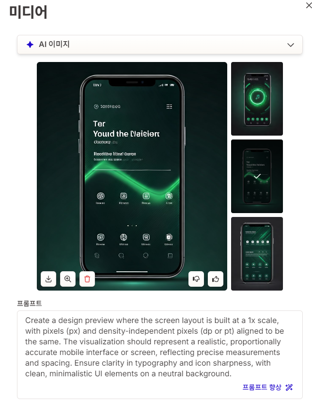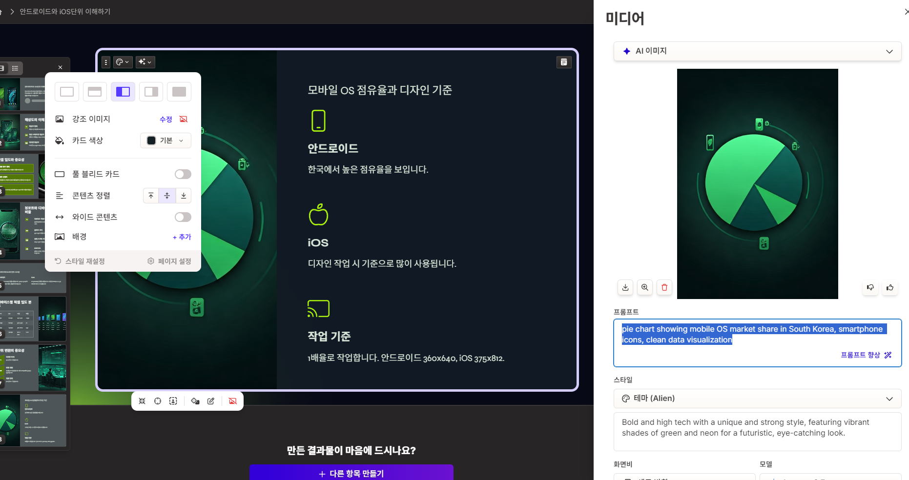 이미지 출처에 AI이미지를 사용할 수 있는데 스타일을 지정하면 그 분위기에 어울리는 이미지가 자동 삽입됩니다.