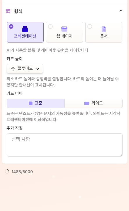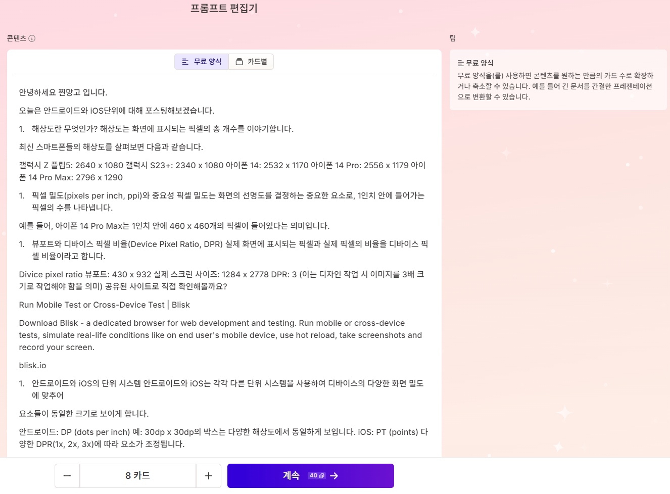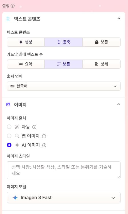 카드당 최대 텍스트 수는 짧게 할 것인가, 간결한 단락으로 갈 것인가 여러 개의 세부단락을 갈 것인가로 지정할 수 있고