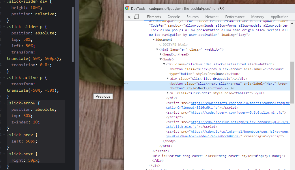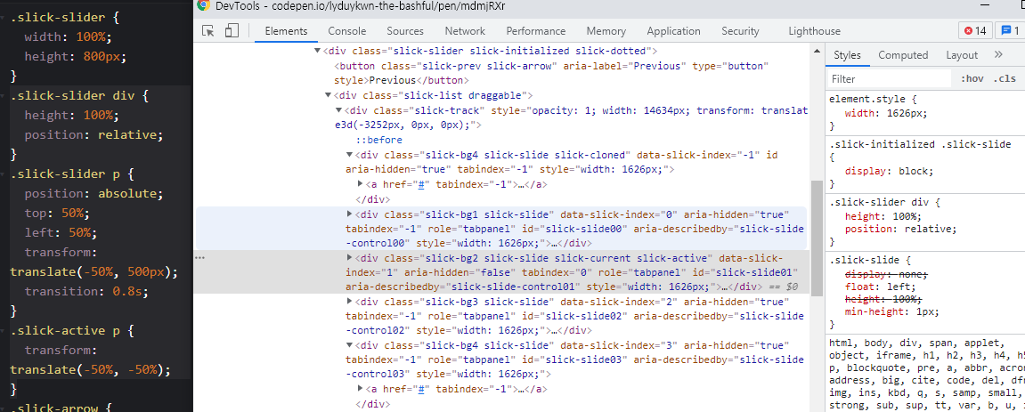 absolute로 각각 위치를 잡아줄 거라 그 부모인 slick-slider인 <div> 요소에 relative가 있는지 체크해봐야 해요