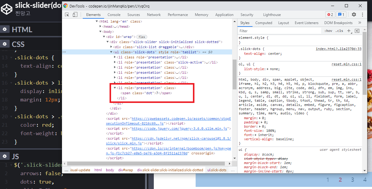 slick-dots의 모양을 숫자 형태로 변경해 보았습니다.