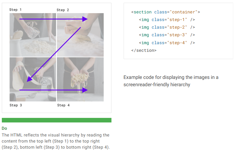 하지만 스크린 리더는 기본적으로 HTML 코드의 위에서 아래로 작성된 순서대로 읽습니다. 그래서: