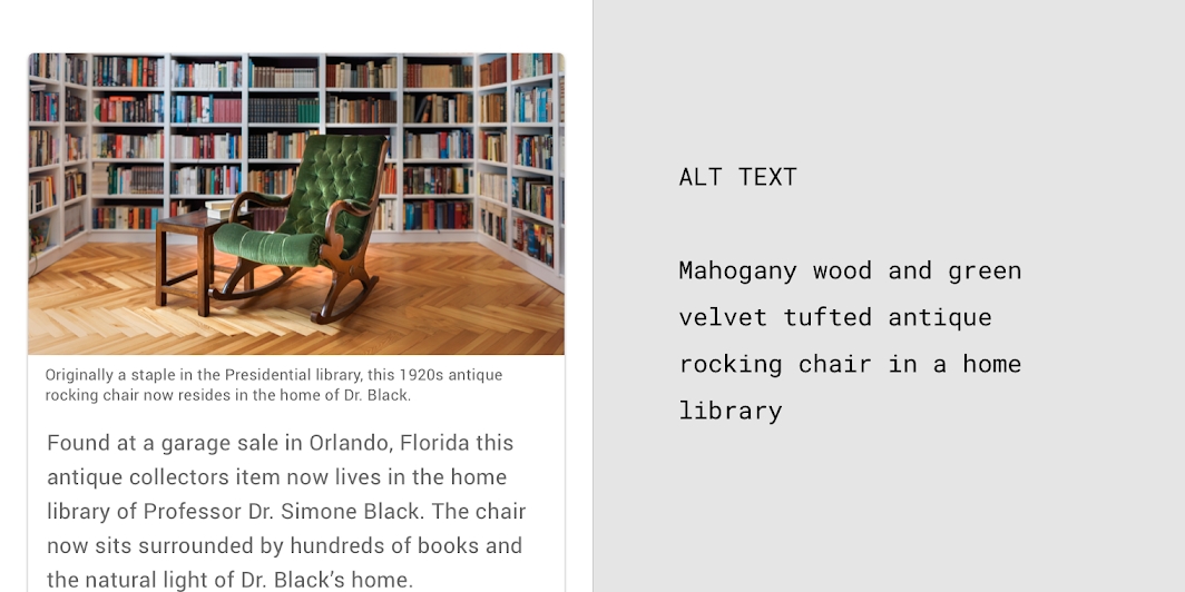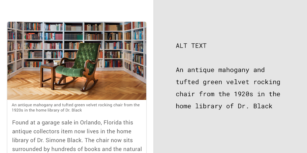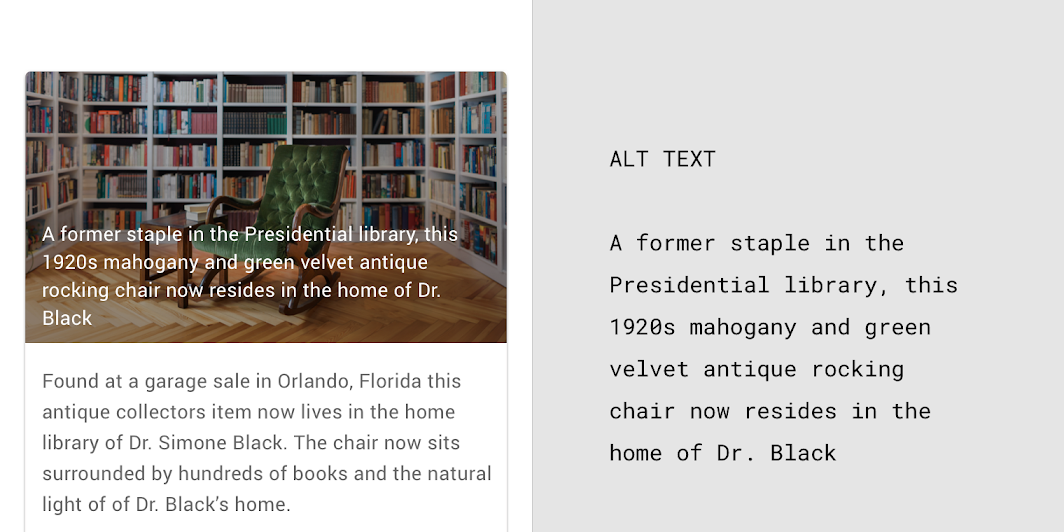 → 시각 사용자와 스크린 리더 사용자 모두 캡션을 통해 자산의 설명을 얻습니다.