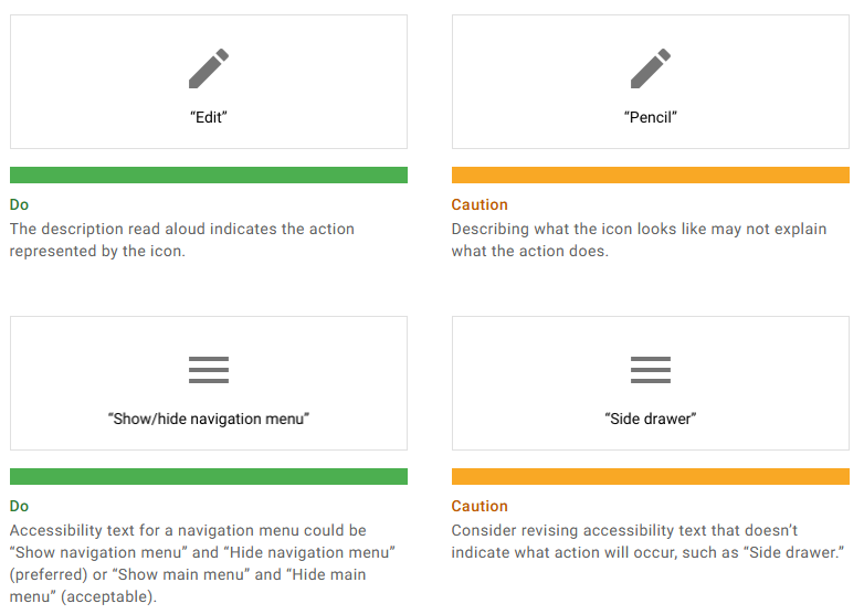 - 아이콘의 **모양(연필)**만 설명하는 것은 그 아이콘이 무엇을 하는지(편집) 설명하지 않으므로 적절하지 않습니다.