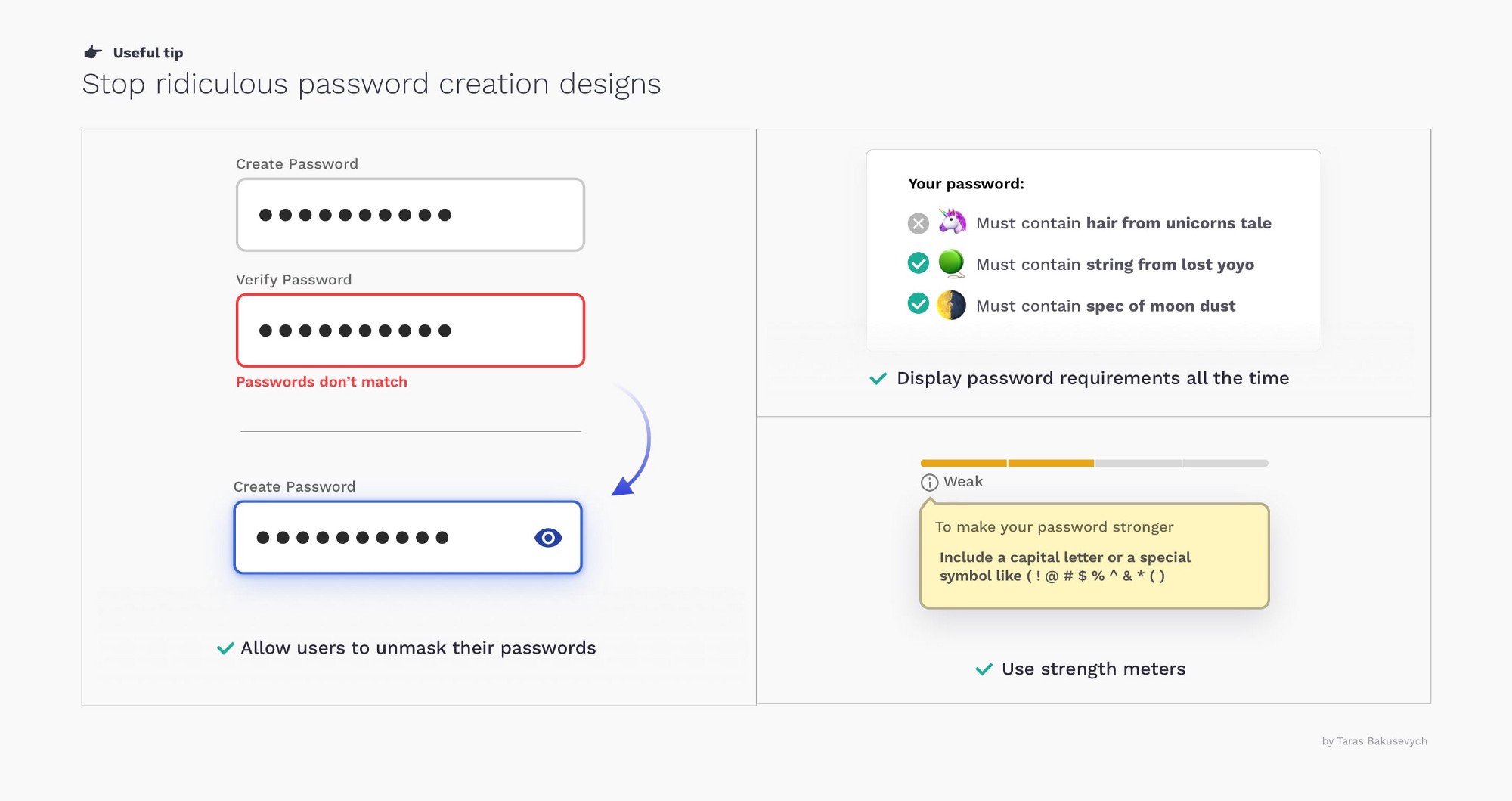 - 항상 패스워드 요구사항을 보여주고, 사용자의 패스워드가 요구사항에 얼마나 맞는지 보여주어라.