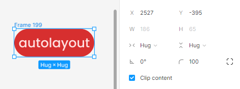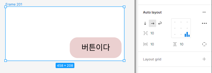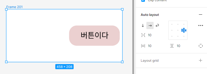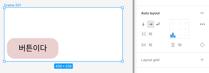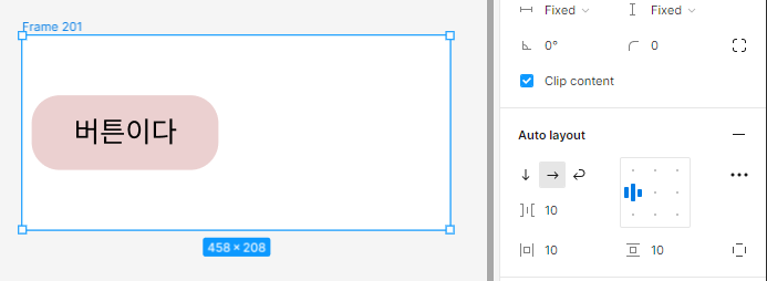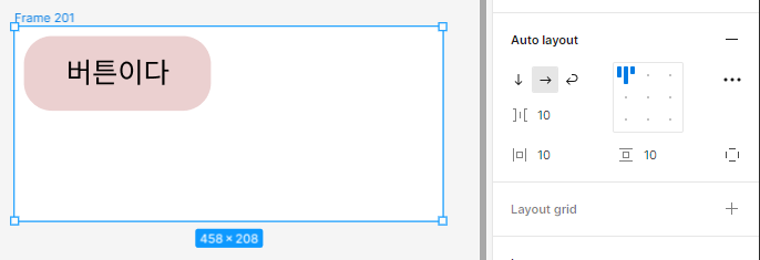 일단 프레임으로 만든 버튼요소는 저렇게 사이즈를 보면 Hug처리가 되어있는데