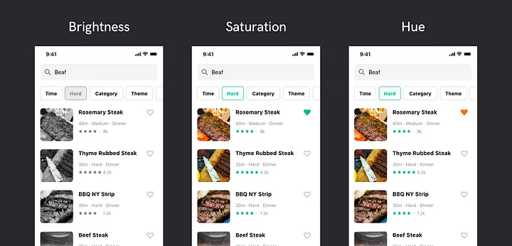 색상을 희미하게 구분해야 하는 상황이라면, 색상을 사용하여 요소를 충분히 구분할 수 있는지를 고려해야 합니다.