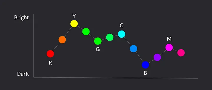 시안(Cyan), 마젠타(Magenta), 노랑(Yellow)으로 갈수록 밝아집니다.