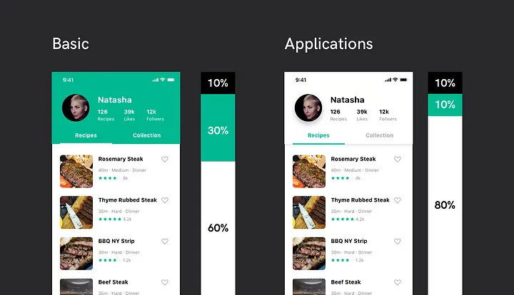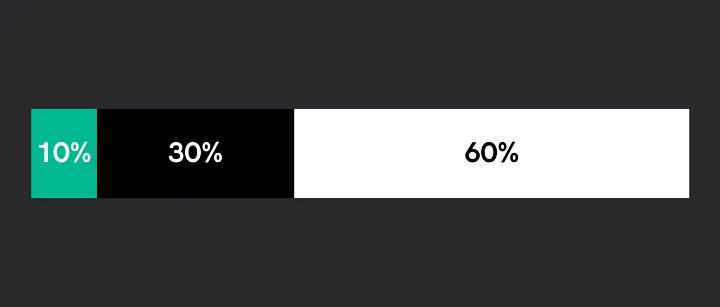 배경 색상은 60%와 30%로 분배하고, 강조해야 할 요소나 텍스트 중심의 서비스에는 10%를 할당합니다.