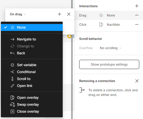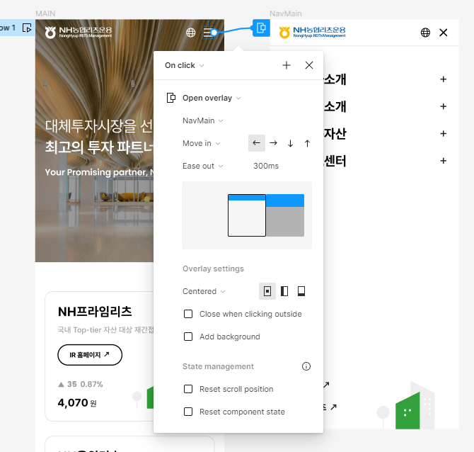 Close overlay를 누르면 자동으로 왼쪽에서 오른쪽으로 사라지는 프레임을 확인 할 수 있을거에요